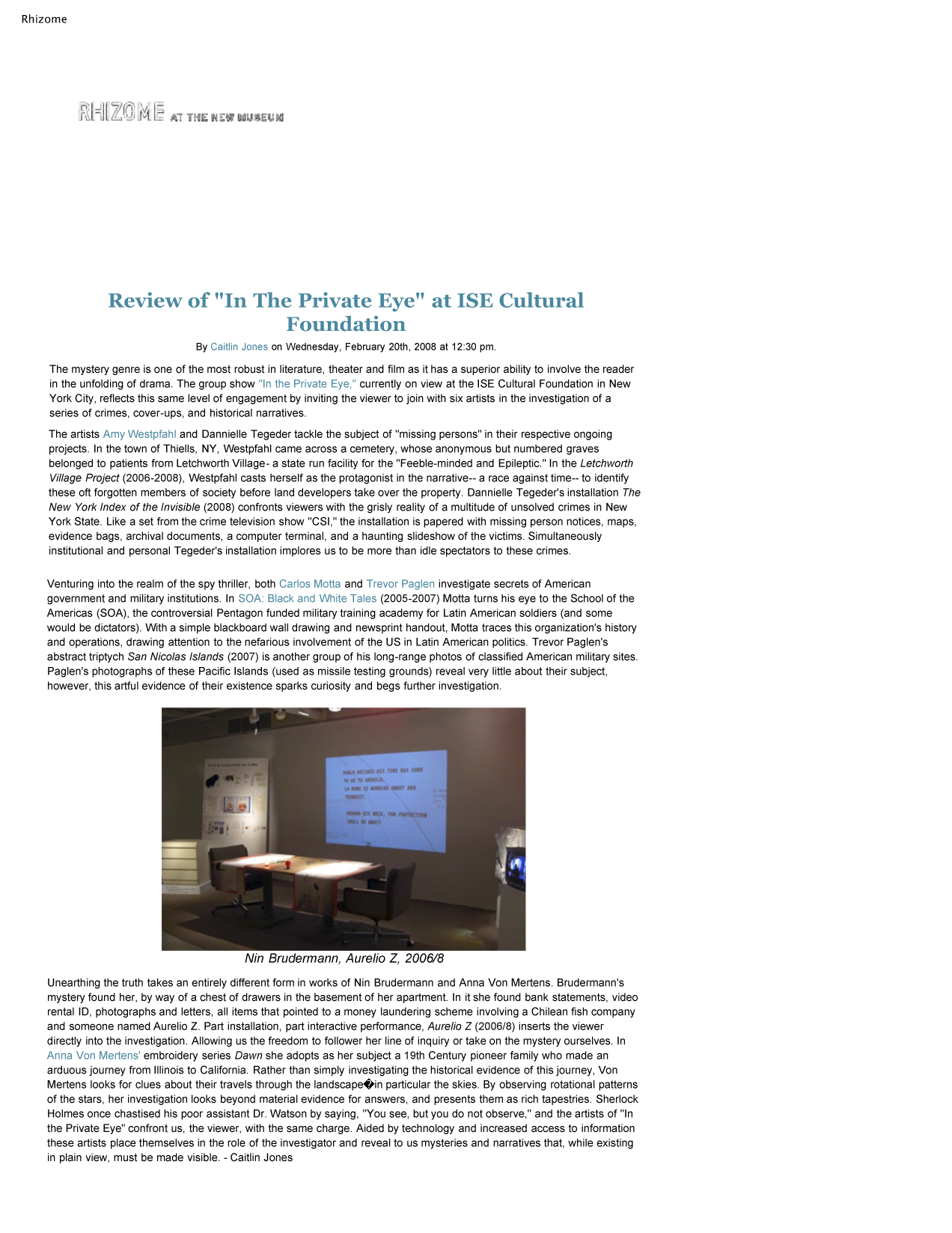 Unearthing the truth takes an entirely different form in works of Nin Brudermann. Her mystery found her, by way of a chest of drawers in the basement of her apartment. In it she found bank statements, video rental ID, photographs and letters, all items that pointed to a money laundering scheme involving a Chilean fish company and someone named Aurelio Z. Part installation, part interactive performance, Aurelio Z (2006/8) inserts the viewer directly into the investigation. Allowing us the freedom to follow her line of inquiry or take on the mystery ourselves.' Caitlin Jones, RHIZOME at the New Museum NY, February 20th 2008