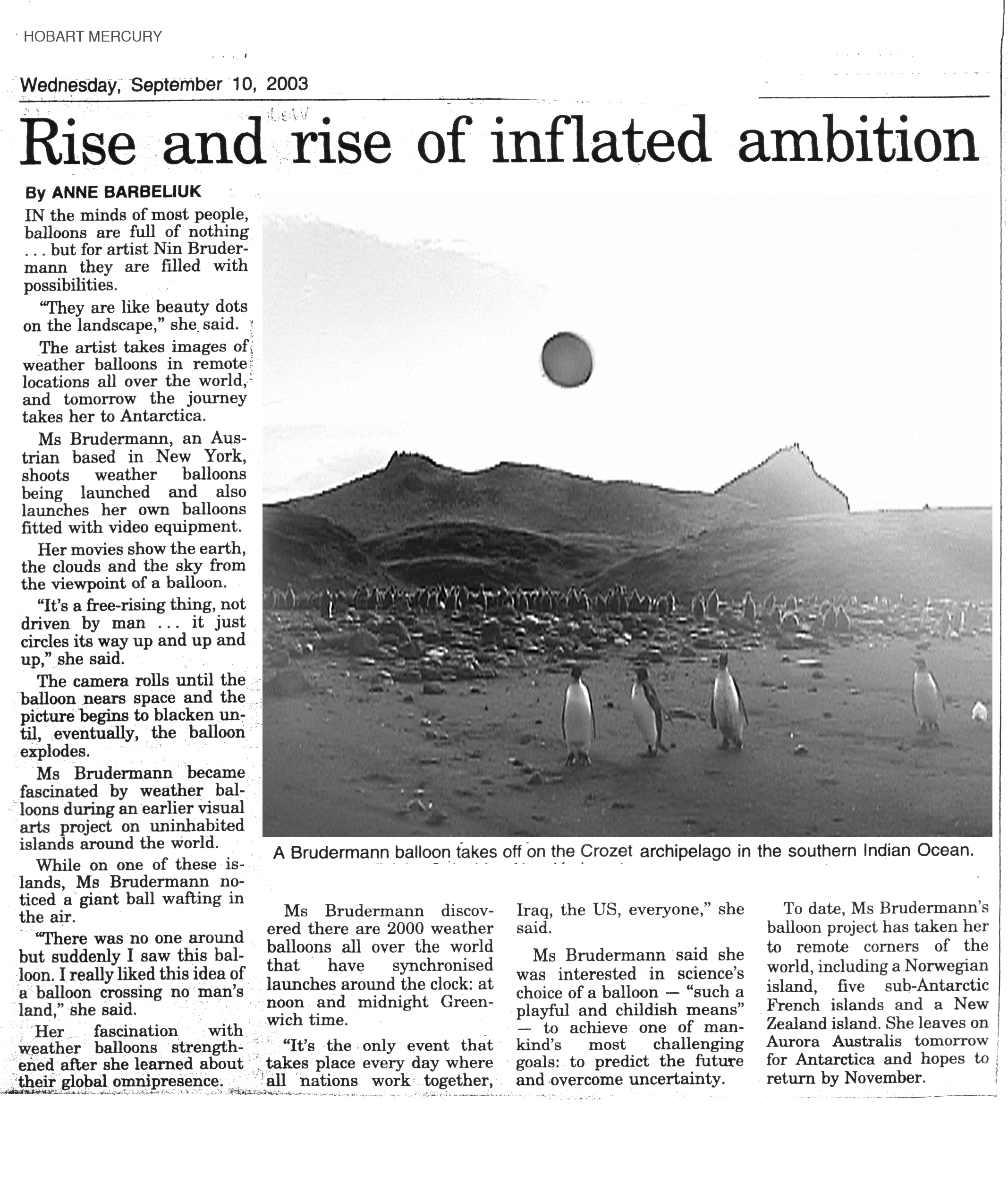 'The Art of the Impossible Made Real. In a unique example of world cooperation, every day 2,000 weather balloons are released from some of the world's most isolated spots. For Brudermann's participation in this sort of earthly ballet and scientific ritual, she replaced the scientific instruments with a camera.' Annick Bureaud, art press, 02.2004
