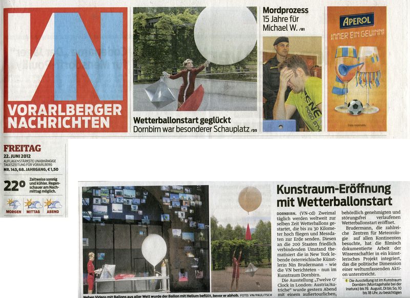 'Meteorologists across the world release weather balloons every day on the dot of twelve noon and every night at midnight (London time). With her performance the artist managed to translate the conceptual into another reality and did so in an artistic act. The title of the performance, and the performance itself, plays with the genre of the Eurovision Song Contest and turns it into a contest of nations. In the performance, she uses the scientific material as a backdrop, i.e., a foundation for the performance and, in the end, for the exhibition. Brudermann reduces ad absurdum the performance that draws on a thematic substructure, the meteorological act, and shifts it to a conceptual domain. In the end, the meteorological act serves as an earnest accompaniment to a long-term project, whose significance goes much further than an aesthetic event. Its fascination lies much more in a political, people-uniting aspect that takes place every day and even twice daily without most people ever being aware of it. So Brudermann carries on a flip-flop game with art, politics, science and nature and not only opens our eyes to the absurdity of many a specialized scientific activity, but also to its significance. What Nin Brudermann calls into question is reality as we see it.' Anna Karina Hofbauer, curator